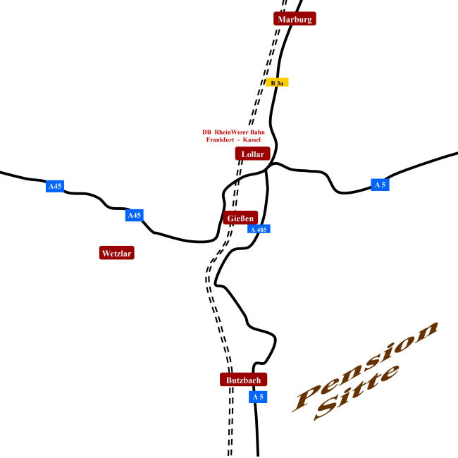 Lollar liegt verkehrsgünstig an der Rhein-Weserbahn. Die Bahnlinie ist die Hauptverbindungsstrecke zwischen Kassel und dem Ballungszentrum Frankfurt. Der Bahnhof Lollar liegt ca. 300 Meter von unserer Pension entfernt. Sie erreichen uns vom Bahnhof Lollar bequem zu Fuß.