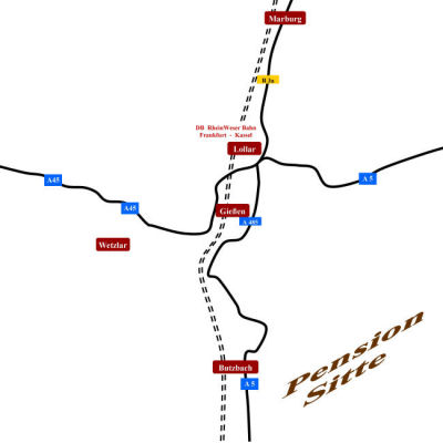 Lollar liegt verkehrsgünstig an der Rhein-Weserbahn. Die Bahnlinie ist die Hauptverbindungsstrecke zwischen Kassel und dem Ballungszentrum Frankfurt. Der Bahnhof Lollar liegt ca. 300 Meter von unserer Pension entfernt. Sie erreichen uns vom Bahnhof Lollar bequem zu Fuß.